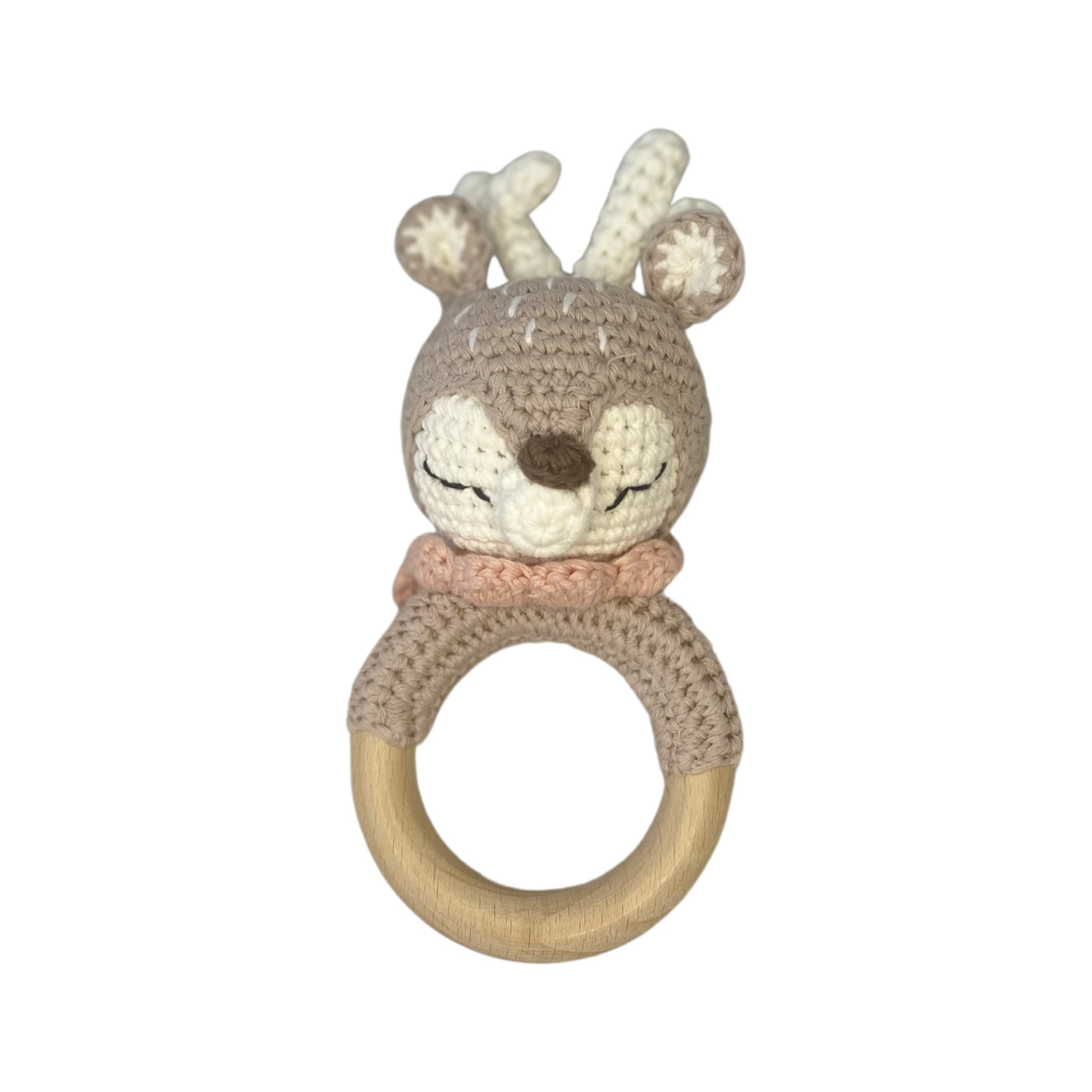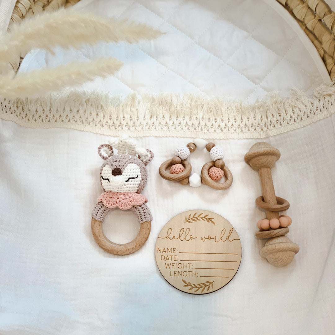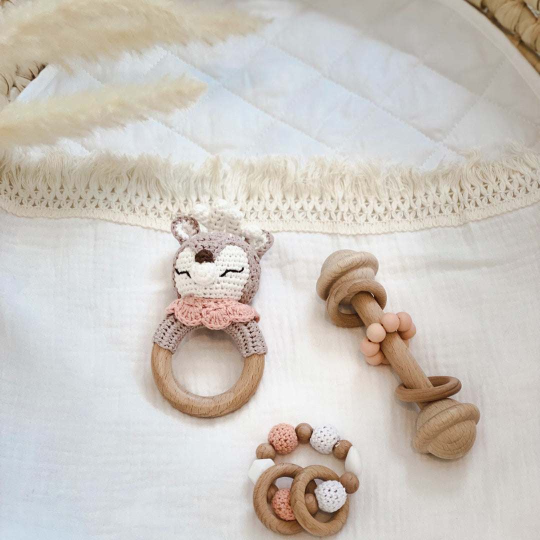 This adorable baby crochet wooden pink deer rattle is the perfect addition to any nursery. Crafted from natural beechwood, this rattle features a gentle sound that is sure to soothe your little one.