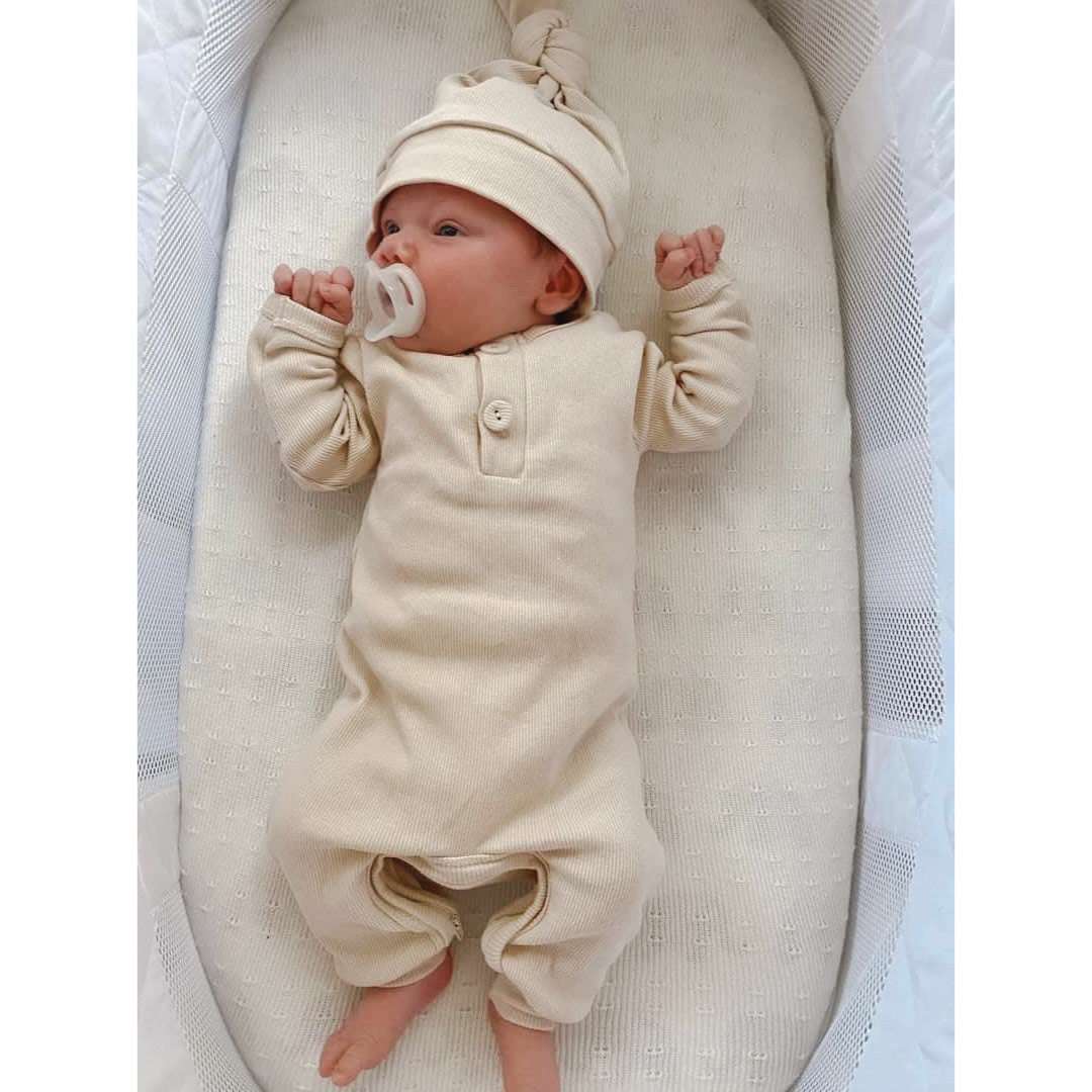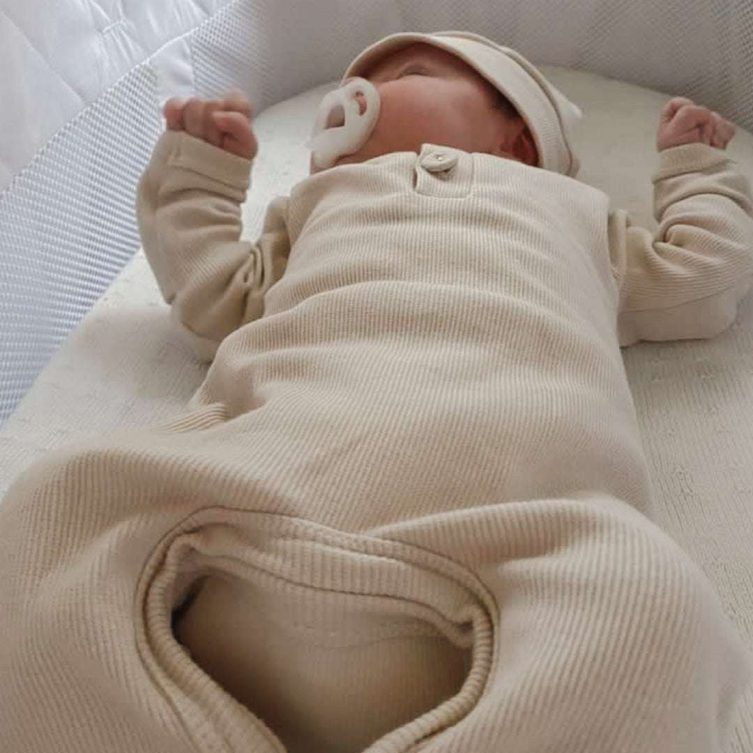 This cute baby onesie is the perfect choice for your little one. It is made from organic cotton and features a ribbed design. It has long sleeves and mitten cuffs on the arms that fold over to stop baby from scratching and keep warm. The zipper on the legs makes it easy for changing.