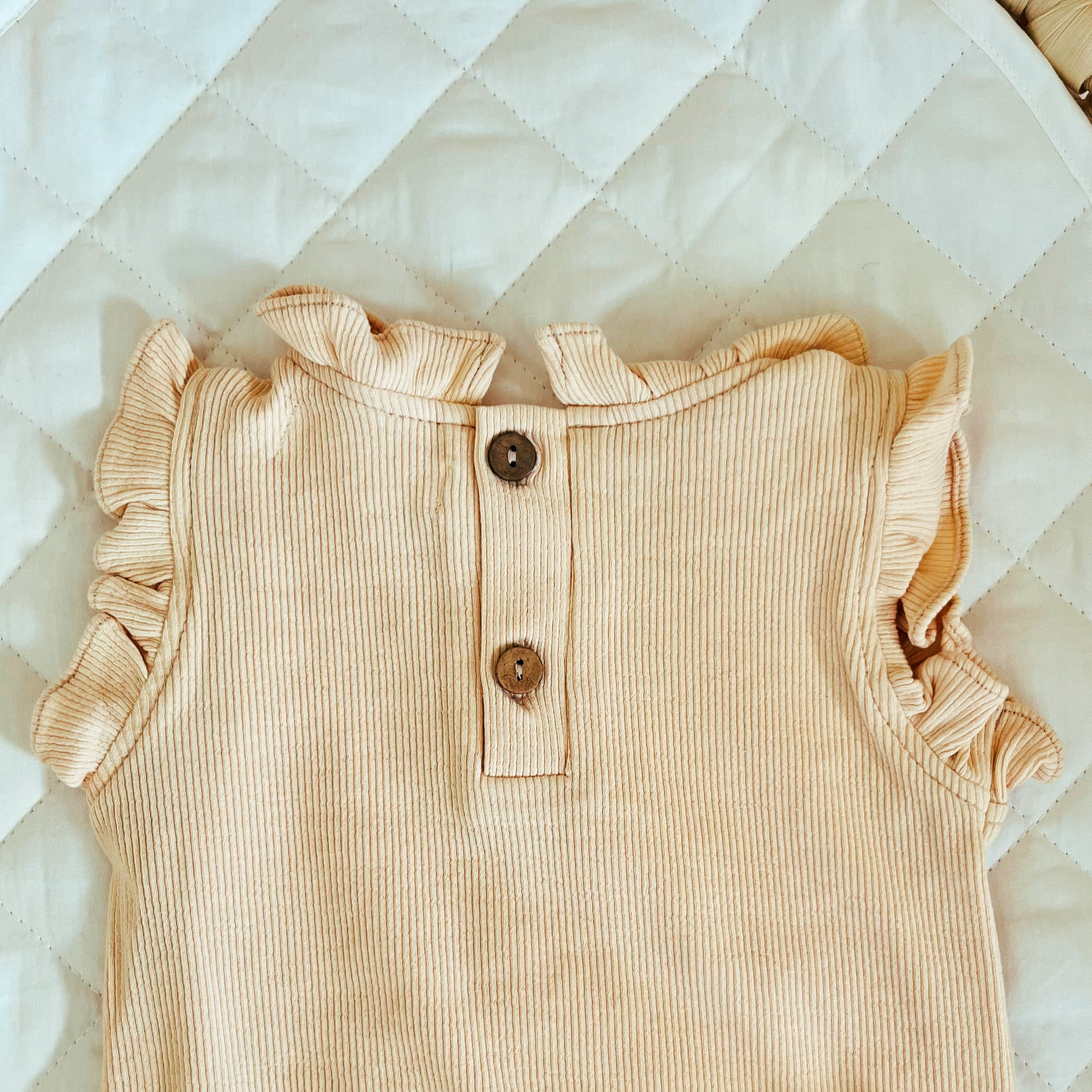 Two Piece Ribbed Frill Romper & Shorts Set | Beige